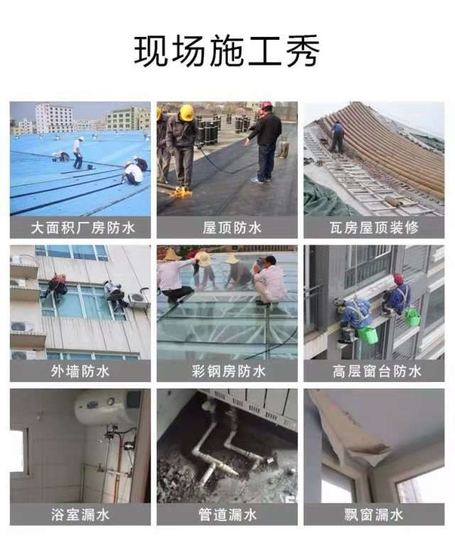 1、 屋面防水补漏: 各类建筑屋面墙面防水、钢结构屋面防水、彩钢板防水、混凝土、玻璃、各种金属质、各类瓦屋顶防水维修工程。